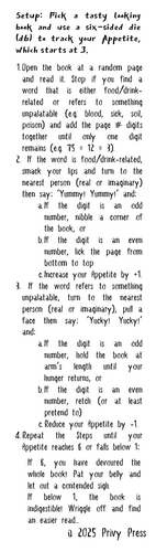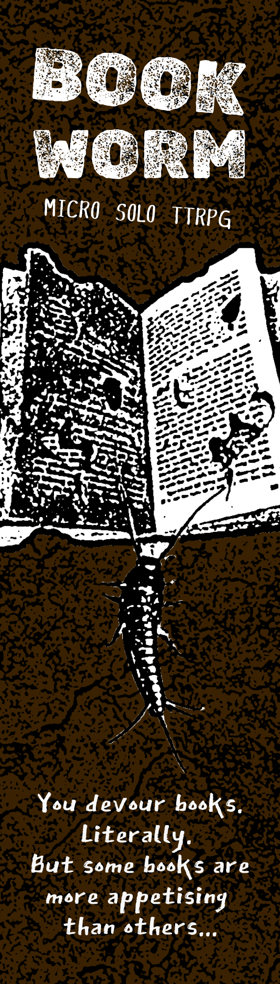 A micro solo TTRPG. Requires a book (the tastier the better) and a six-sided die (d6).